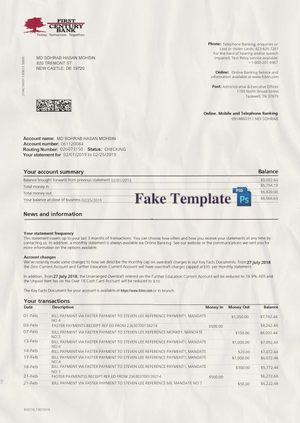 First Century Bank Statement Psd – Payoneer Bank Statement