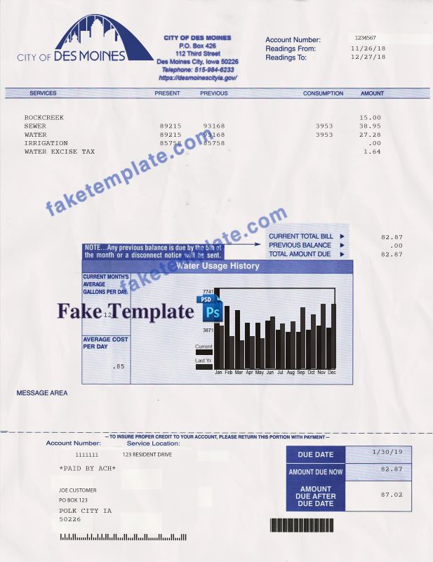 Iowa Water Utility Bill Template: Iowa Proof of address psd template