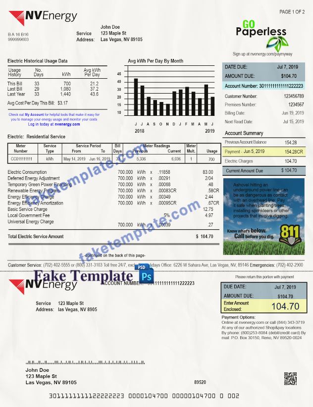Nevada Utility Bill Template: Nevada Proof of address psd template