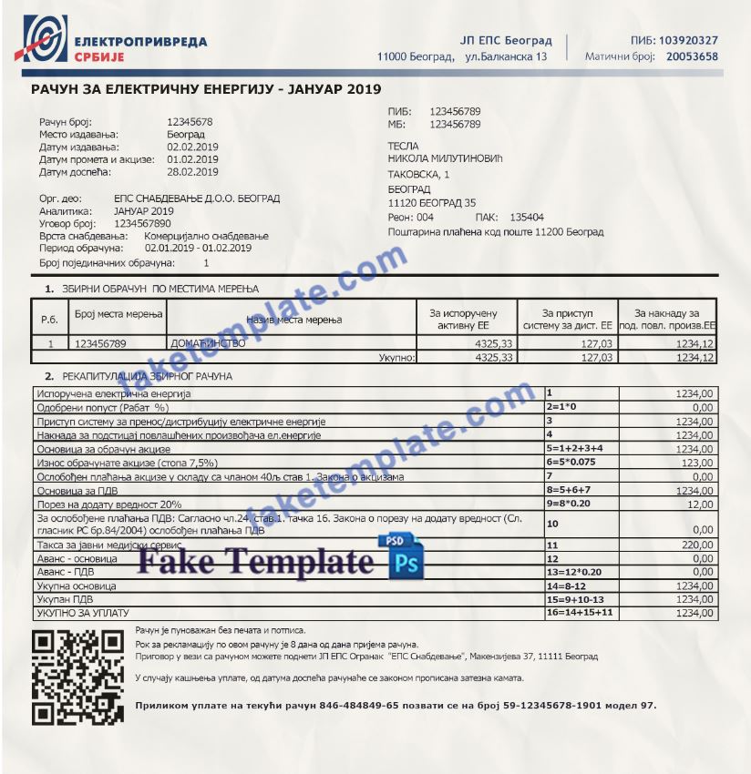Serbia Utility Bill Template: Serbia Proof of address psd template